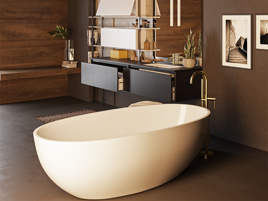 - Statement baths in darker tones: Brushed brass provides balance, preventing the design from feeling too heavy.